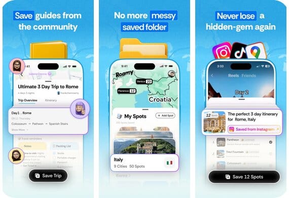 You've saved 400 travel posts across Instagram and TikTok. You rewatch them to find locations. You lose half the spots. Roamy fixes this in one tap — pull every location out of any video, drop it on a map, then tell it how many days you have. It builds a day-by-day itinerary from your own saved content.